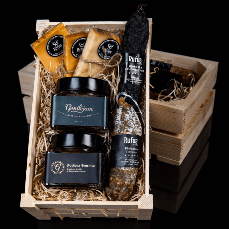 Dřevěná bednička má rozměr 32cm (délka) x 21cm (šířka) x 12cm (výška). Dárkové balení je zabalené do celofánu, abyste se už o nic víc nemuseli starat.