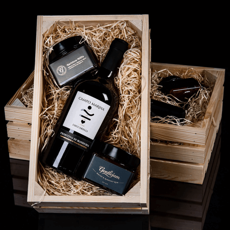 Dřevěná bednička má rozměr 34cm (délka) x 20cm (šířka) x 12 cm (výška). Dárkové balení je zabalené do celofánu, abyste se už o nic víc nemuseli starat.