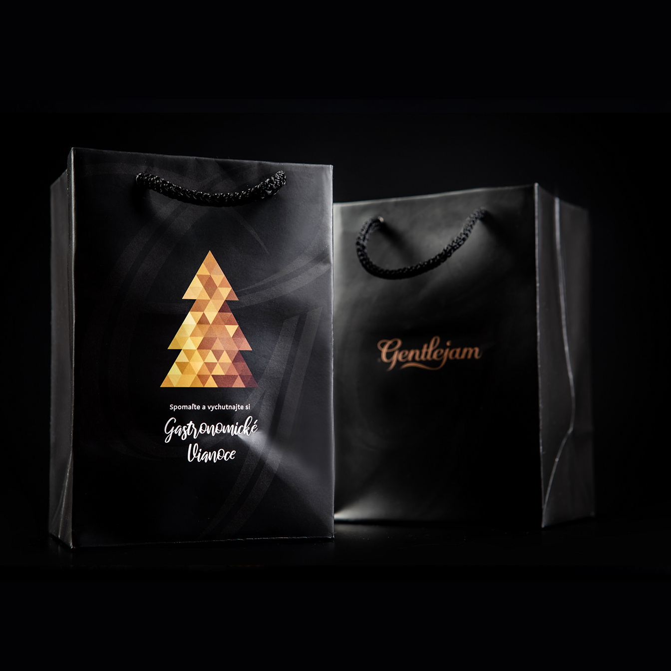 Na přední straně je text: „Spomaľte a vychutnajte si Gastronomické Vianoce“ a na zadní straně je logo Gentlejam.