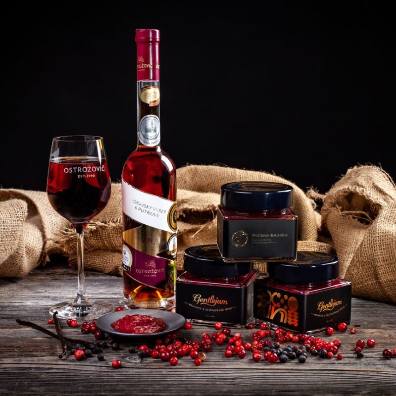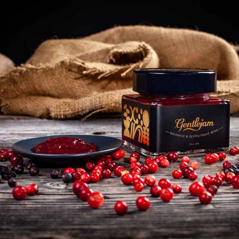 Složení výrobku: Brusinky 65%, cukr, bourbon vanilka, jalovec, jedlé kaštany, šestiputňové víno (alk. 11,5% obj.) 16%.